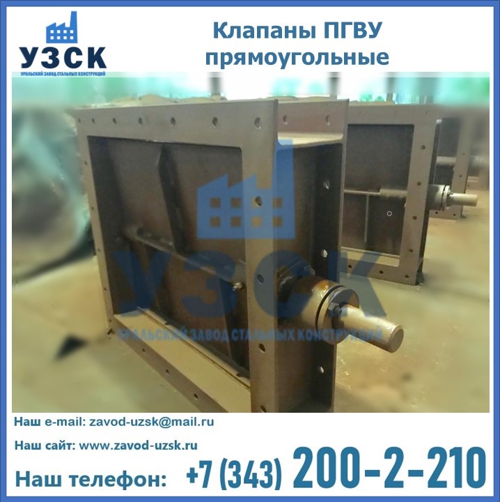 Прямоугольный клапан ПГВУ имеет прямоугольную или квадратную форму, по основному сечению конструкции, на которую устанавливается клапан. Для изготовления шиберов ПГВУ в Сургуте применяются сталь нержавеющая, углеродистая или низколегированная, в зависимости от модели. Внутри клапана имеется запорный элемент, передвигающийся параллельно общему потоку движения среды. Запорный элемент, или створка имеет такую же форму, как и основное сечение. Перемещение створки происходит благодаря возвратно-поступательным движениям.