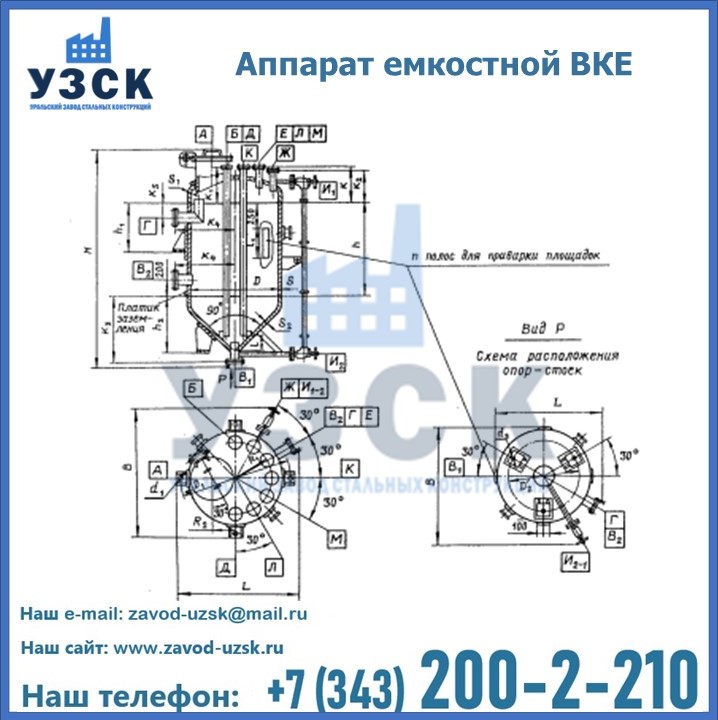 Емкостные аппараты ВКЭ представляют емкость с эллиптической крышей и коническим днищем. аппарат может использоваться в Сургуте для приема и хранения жидкостей и взрыво- и пожароопасных веществ. Создаваемое давление не должно превышать 0,6; 1,0 МПа. Емкости ВКЭ выполняются как цельносварные. Используется марка стали, отвечающая степени агрессивности продукта и температуре эксплуатации.